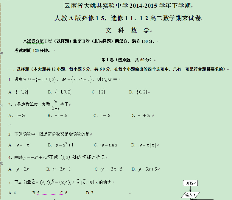 云南省大姚县实验中学2014-2015学年下学期人教A版高二期末试卷(数学文)(杨映鸿)