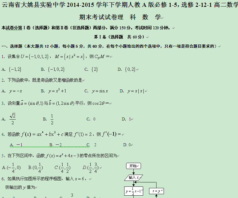 云南省大姚县实验中学2014-2015学年下学期人教A版必修1-5,选修2-1、2-2第二章高二期末质量检测试卷(数学理)