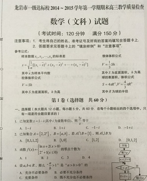 福建省龙岩市一级达标校2015届高三上学期期末质量检查(数学文)扫描版