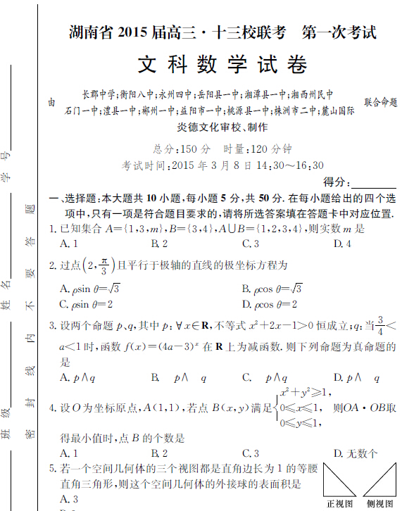 湖南省十三校2015届高三第一次考试(数学文)PDF版