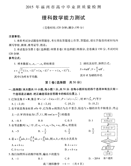 福建省福州市2015届高中毕业班第二次质量检测(3月质量检测)(数学理)扫描版