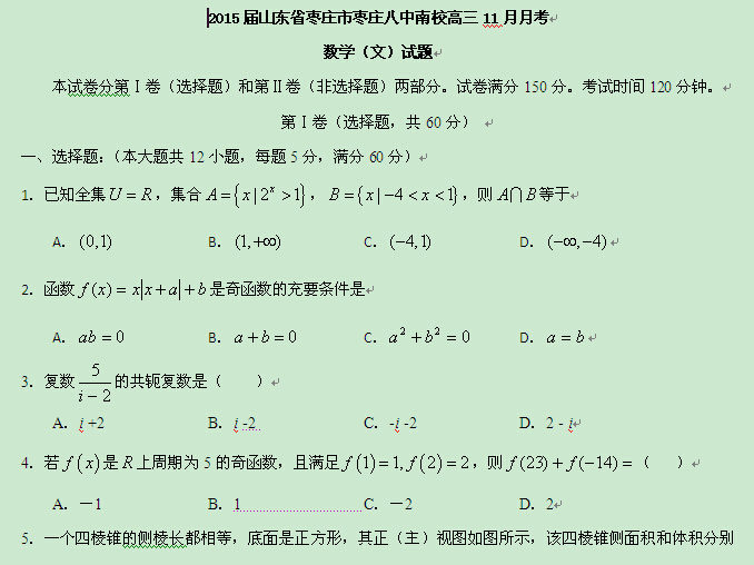 山东省枣庄市枣庄八中南校2015届高三11月月考(数学文)
